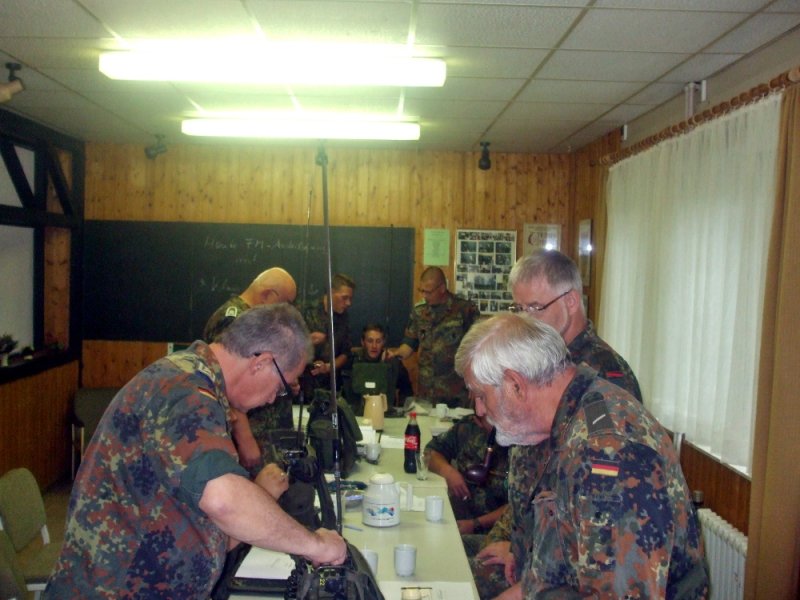 Aber trotzdem haben wir uns am Samstag, den 31.08.2013, mit dem Funkgerät SEM 35 beschäftigt. Unter der Leitung von Oberst d.R. Claus Hoeppner und Hauptfeldwebel Klaus Schlösser, waren 12 Kameraden eifrig dabei ihre Kenntnisse auf diesem Gebiet aufzufrischen. Zu Hilfe kam uns dabei die Erfahrung unserer Leitenden Kameraden, aber auch die Sprechtafel Alpha HSchBtl311. Der erste Teil der Übung war theoretischer Art. Der zweite Teil fand als Funkkreisübung im Gelände statt. Alle Teilnehmer waren begeistert dabei, der später einsetzende Regen rundete das Bild der kleinen Übung ab. Wir haben uns anschließend im Kreise der Kameraden zusammengesetzt und bei Erbsensuppe, Kaffee und Kuchen mit Schlagsahne, unsere gemachten Erfahrungen noch einmal zu vertiefen. Die Veranstaltung endete mit einem kleinen, aber recht kulinarischem Grillabend. Unser Kamerad "Mörser Martin" hat es sich nicht nehmen lassen, selbst aus dem entfernten Werl, anzureisen.