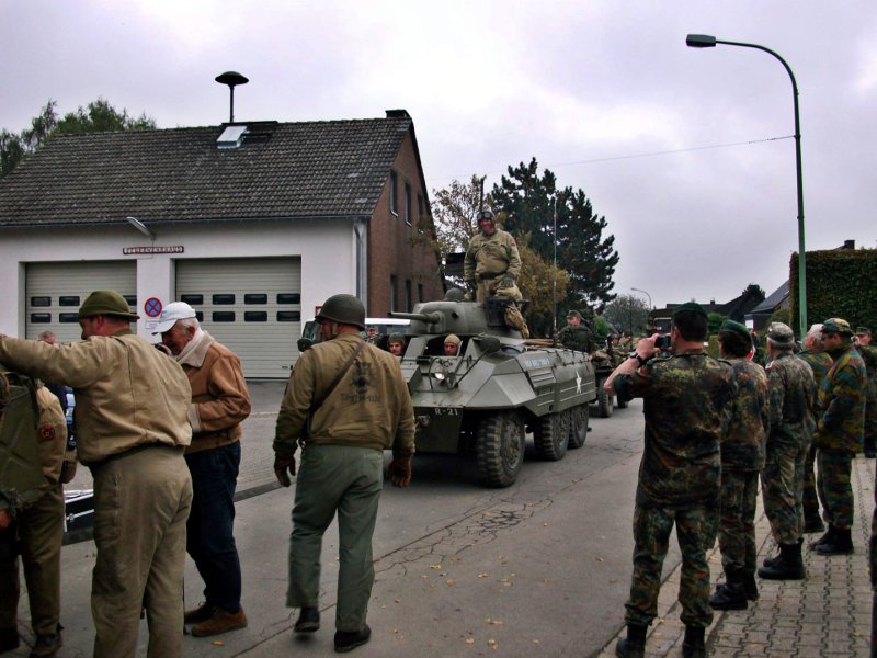 Zur Erinnerung an die Schlacht im Hürtgenwald bauten unsere Freunde von den "Tough Ombres" auf dem Veranstaltungsgelände ein komplettes amerikanisches Feldlager auf. Aber nicht nur das: Posten an Strecken mit Geschütz, mit Verwundeten, mit Lazaretteinrichtung verteilten sich an den Marschwegen. Ein Höhepunkt war hierbei zweifelsfrei die Ausstellung der Collection 39 - 45 der Reenactmentgruppe des gleichnamigen Museums aus den Niederlanden. Mit einer Fahrt durch den Ort Vossenack mit Halbkettenfahrzeug und amerikanischen Jeeps aus dieser Zeit wurde noch einmal die Erinnerung an die damaligen Kriegsereignisse wachgerufen.