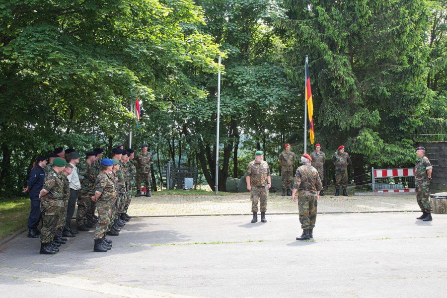 14:45Uhr </br> Schlussappell. Nach dem Antreten und dem feierlichen Einholen der Flaggen war es Zeit Abschied zu nehmen. Wir tauschten sehr freundliche Dankesreden aus und ich muss gestehen, dass mir der Abschied von unseren niederländischen Kameraden nicht gerade leicht viel. Dies gilt auch für unsere Gäste. Aber schließlich war dann doch alles eingepackt, die Jungs an Bord des großen Busses und wir schossen ein letztes Foto zur Erinnerung.