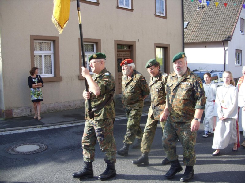 Am äußeren Rande Bayerns, im schönen Frankenland, da liegt Frankenbrunn. Ein kleines Dorf in hügeliger, bewaldeter Umgebung, die Kirche genau in der Mitte, einige wenige hundert Einwohner. Das ist Frankenbrunn. Das besondere an Frankenbrunn, es hat einen Musikverein “Frohsinn“, der am Samstag den 05.Juli 2014, aber auch noch am Sonntag und am Montag sein 150 jähriges Bestehen feierte. Nun fragt man sich sicher, was haben Reservisten aus dem Hürtgenwald, dort zu suchen? Die Antwort ist einfach, gleichzeitig feierte die Krieger – und Soldatenkameradschaft e.V. ihr 90 jähriges Bestehen. Sie haben richtig gelesen, 90 Jahre Reservistenvereinigung im Frankenland. Ich setze noch einen drauf, kein geringerer als König Ludwig II von Bayern war der Gründervater der bayerischen Veteranenvereine. Die Reservistenvereinigung Frankenbrunn wurde gegründet von heimkehrenden Kriegern (Soldaten) des 1.Weltkrieges, als Schicksals – Interessengemeinschaft. Ihre Sorge galt ihren Familien und Mitmenschen in der Dorfgemeinschaft. Von Anbeginn an bis in die heutige Zeit hat die Krieger- und Soldatenkameradschaft und natürlich auch der Musikverein "Frohsinn" ihren geachteten Platz inmitten der Bevölkerung. Die Reservistenkameradschaft Hürtgenwald verbindet mit den "Franken" eine gute Freundschaft. Gegenseitige Besuche und Anteilnahme am Geschick des jeweils Anderen sind normal. Ja, und es geht sogar soweit, dass 5 "Preußen" seit einiger Zeit Mitglied dieser Kameradschaft sind. Der freundlichen Einladung unserer "Bayrischen Franken" konnten und wollten wir nicht wiederstehen. So begaben wir uns als Abordnung auf die Reise in das schöne Frankenland. Das Wetter, es war sonnig, es war warm und zum Feiern wie geeignet. Von unserem Kameraden Roland mit dem Kleinbus durch die Unbillen des Verkehrs sicher und souverän gesteuert, erreichten wir unseren Zielort am frühen Nachmittag. Pünktlich genug um eine Erfrischung zu nehmen und unsere Freunde zu begrüßen. Wir wurden vorzüglich im Sportheim des Ortes untergebracht und fanden auch noch Zeit uns auszuruhen, denn um 18 Uhr ging es los. Sternmarsch der Musikvereine und vieler befreundeter Reservistenkameradschaften durch den Ort und natürlich zum Festzelt. Die Hürtgenwalder mit dabei.